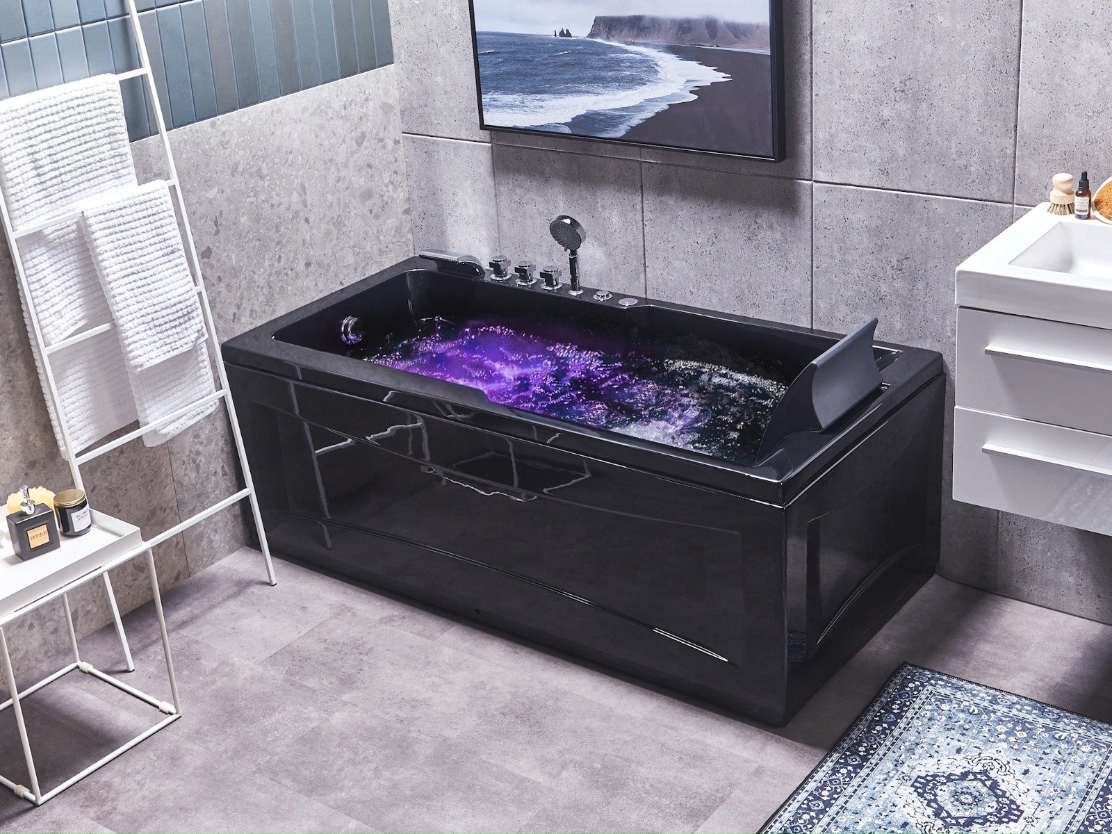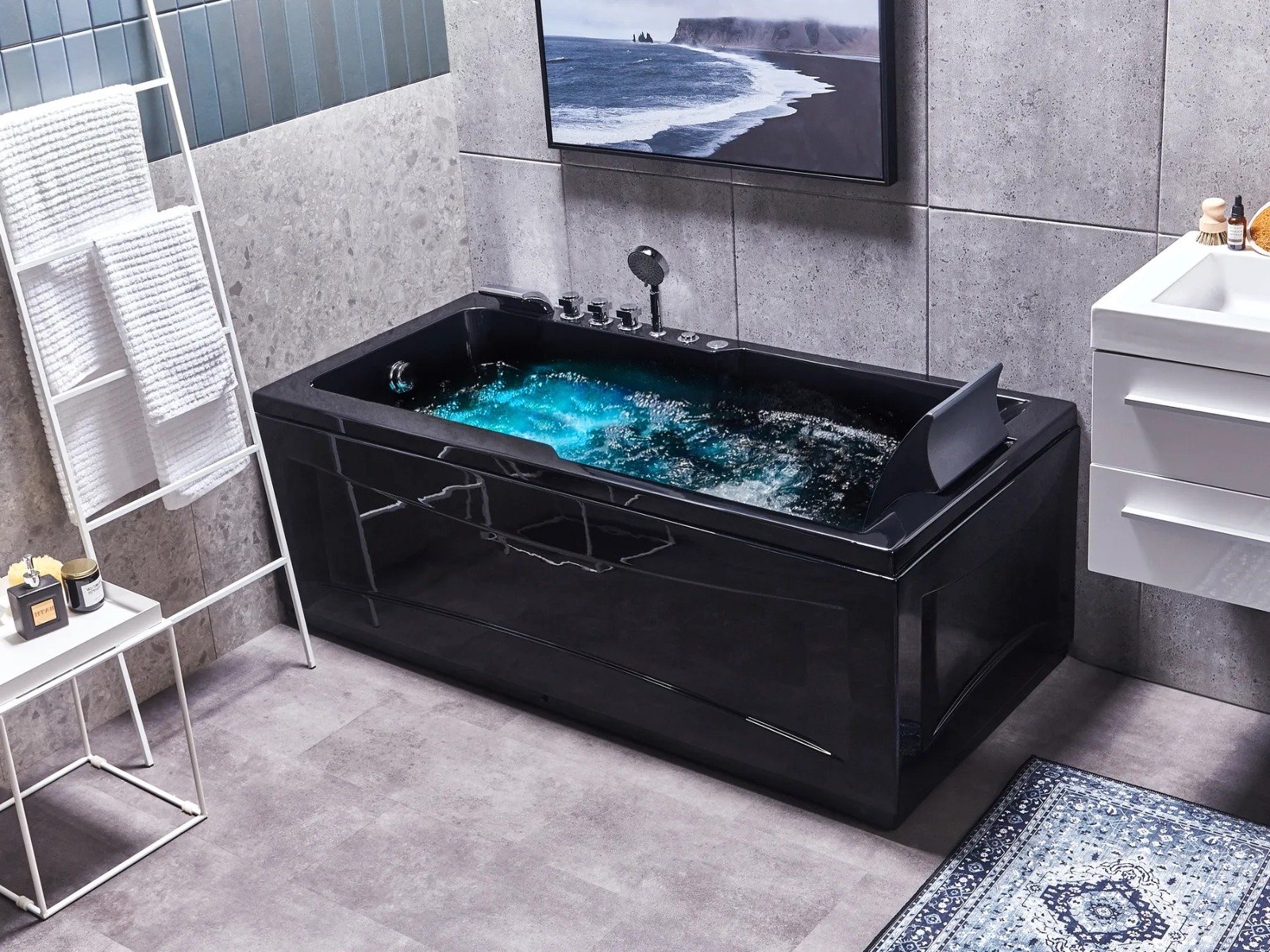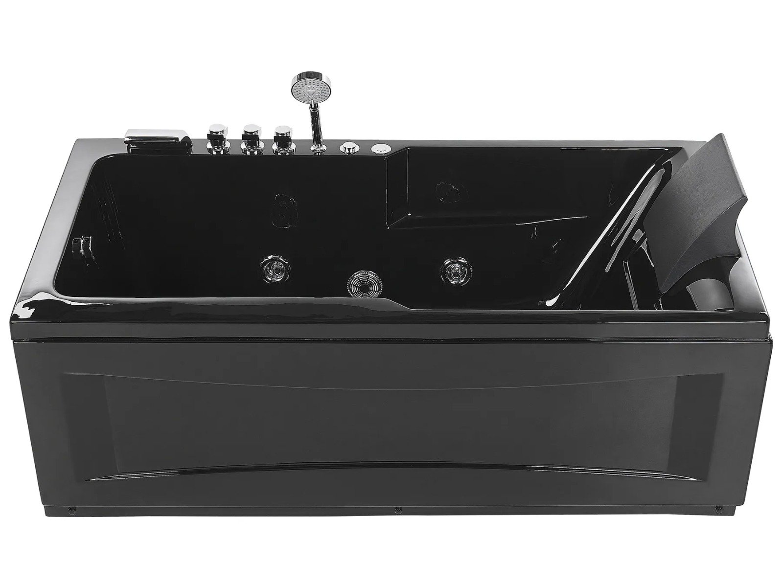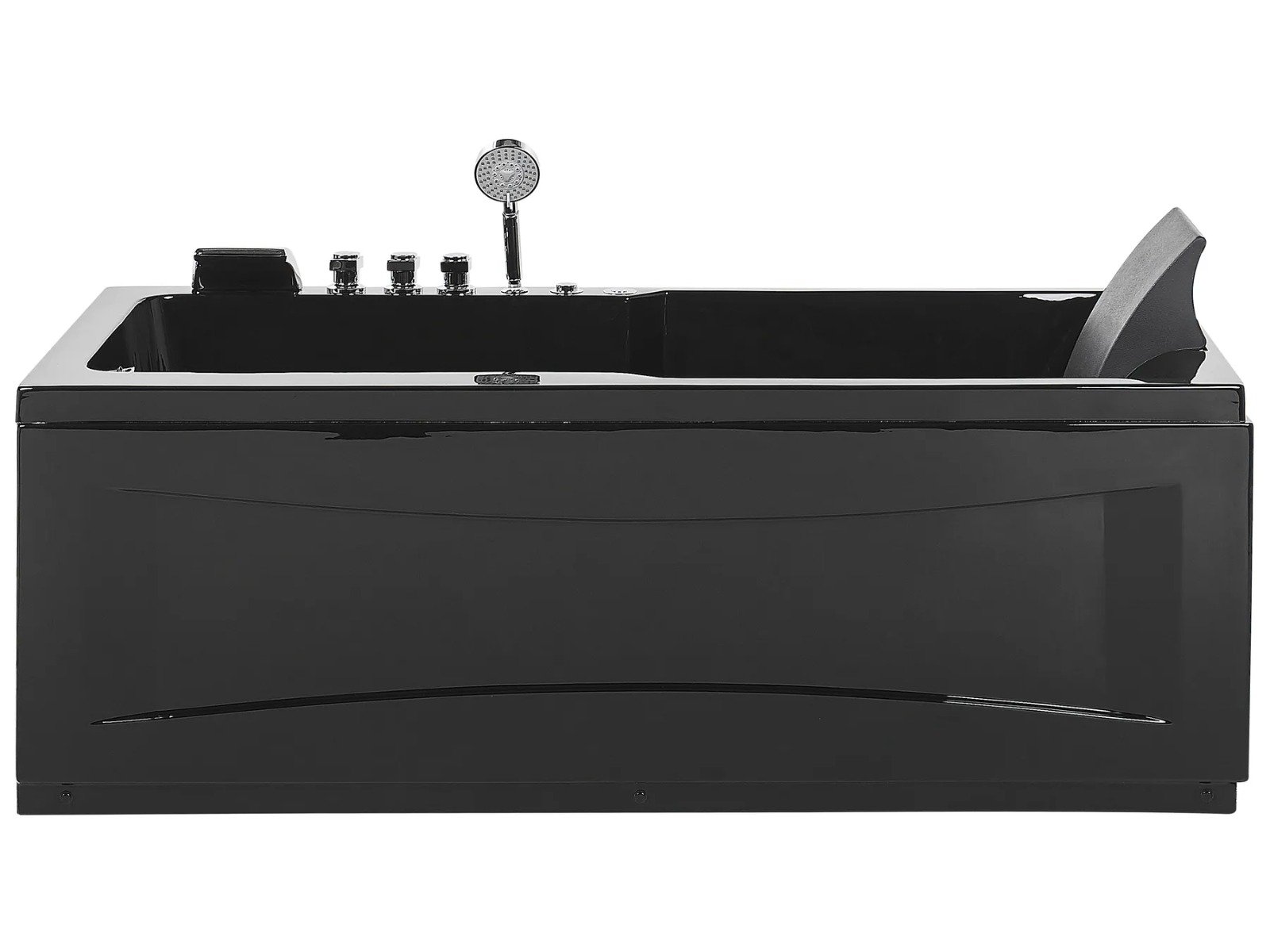 La bañera incluye grifería, una teleducha y un cómodo reposacabezas en color negro para un confort total.