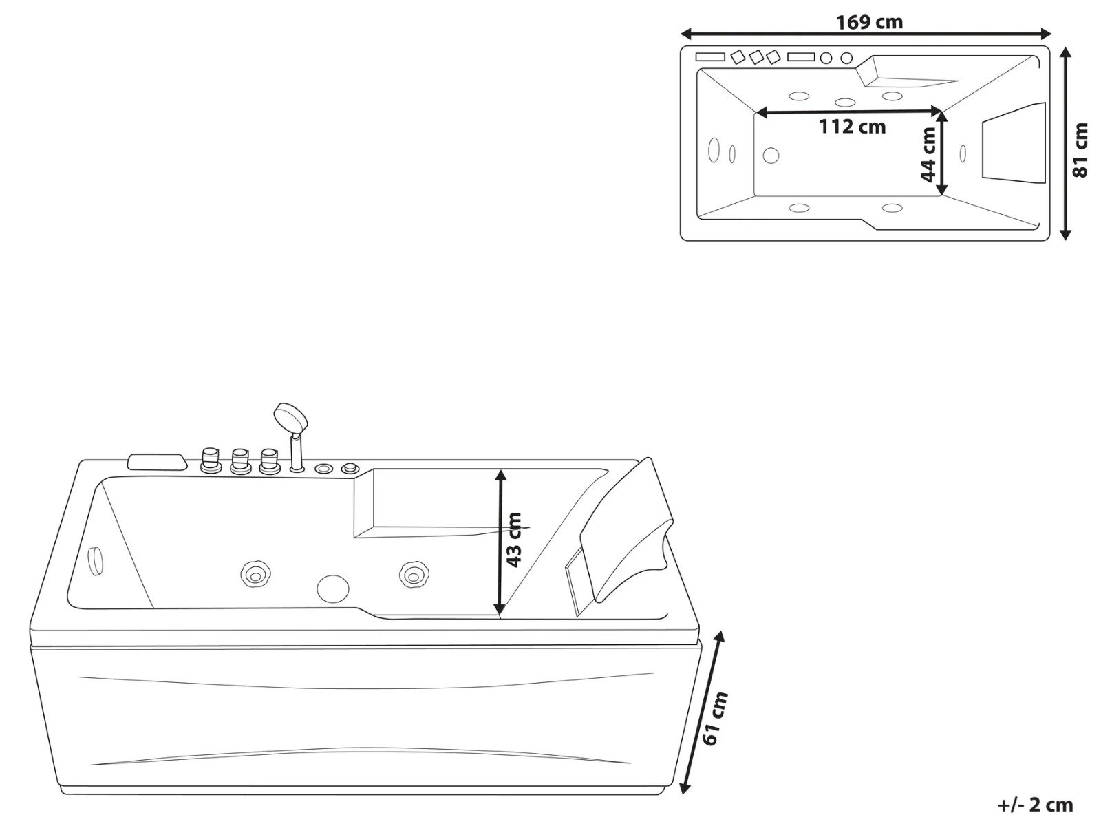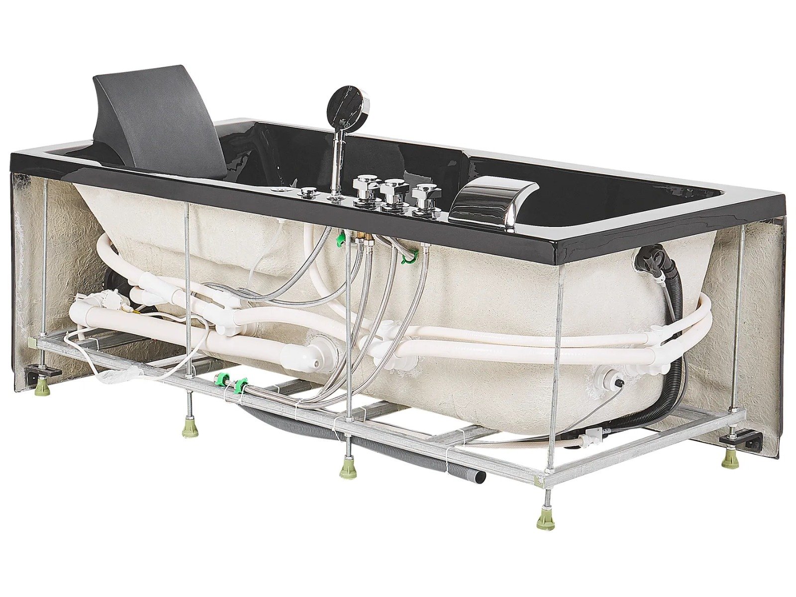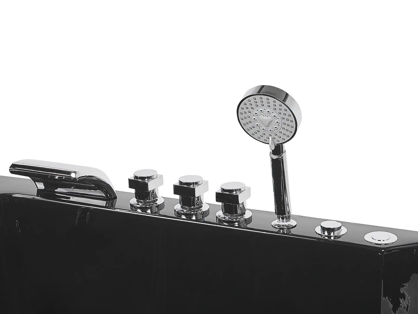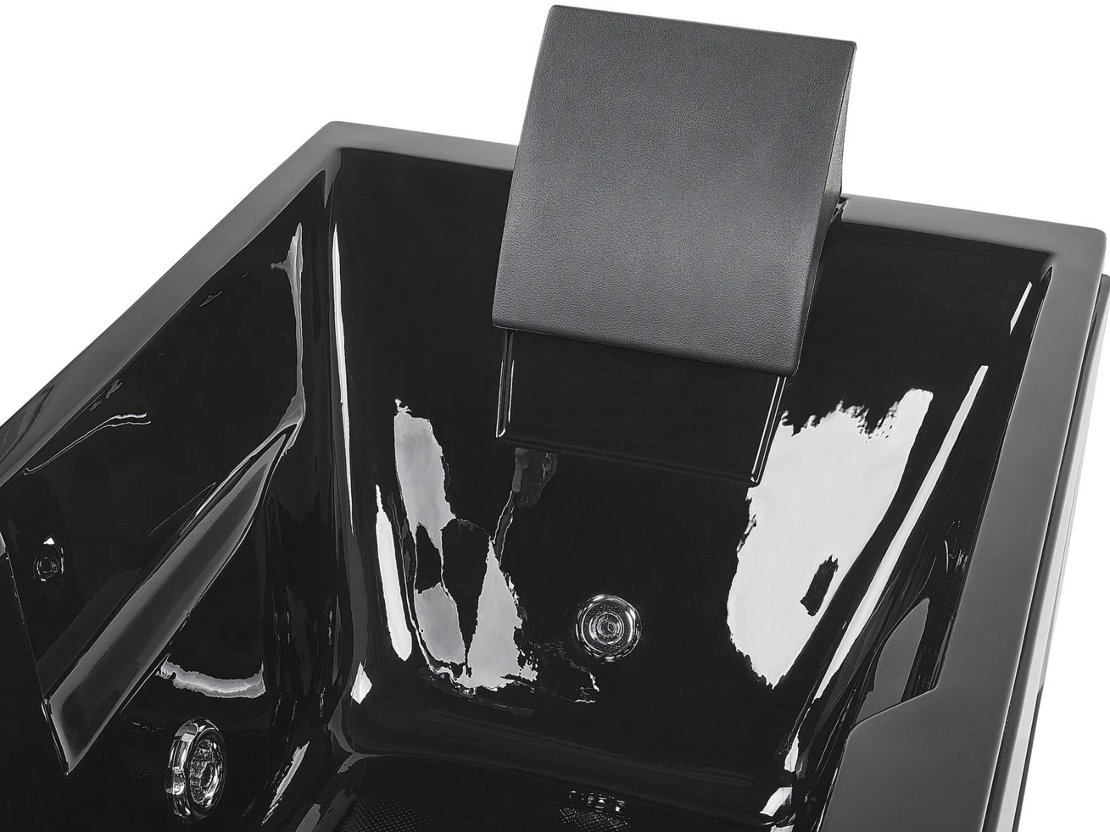 La bañera incluye grifería, una teleducha y un cómodo reposacabezas en color negro para un confort total.