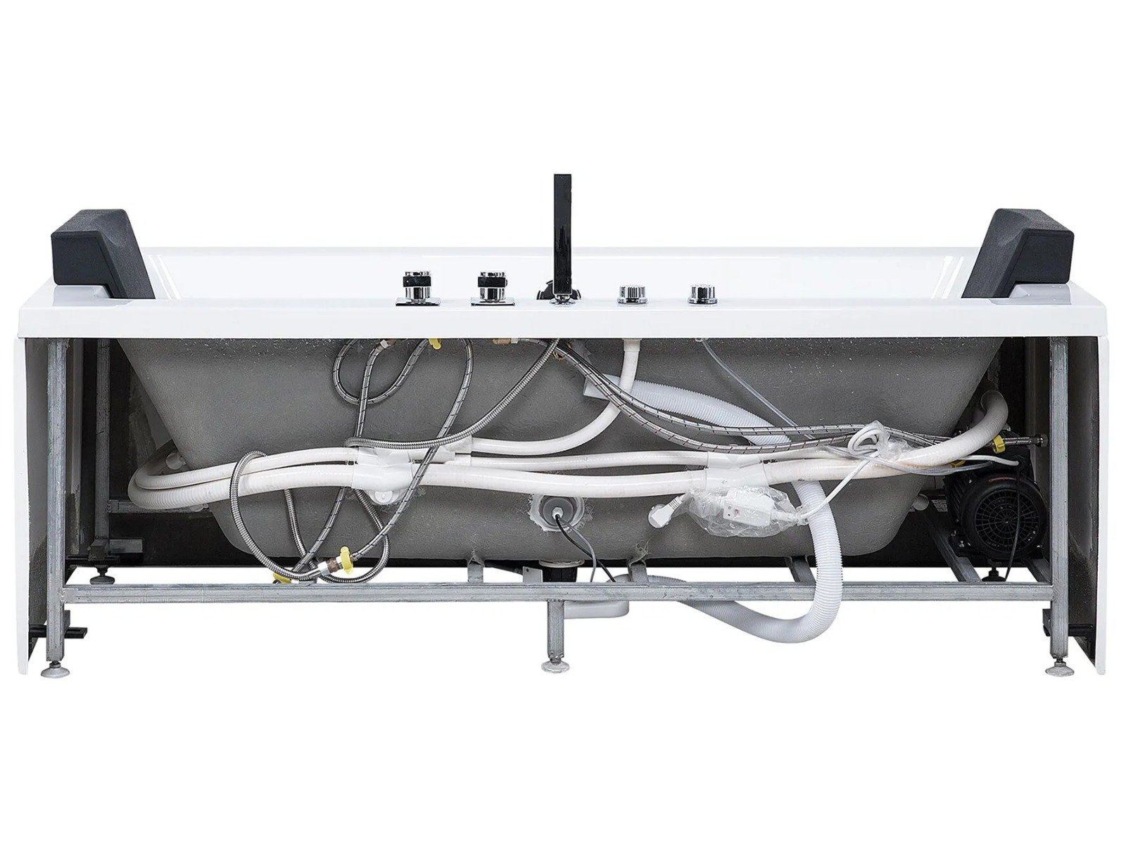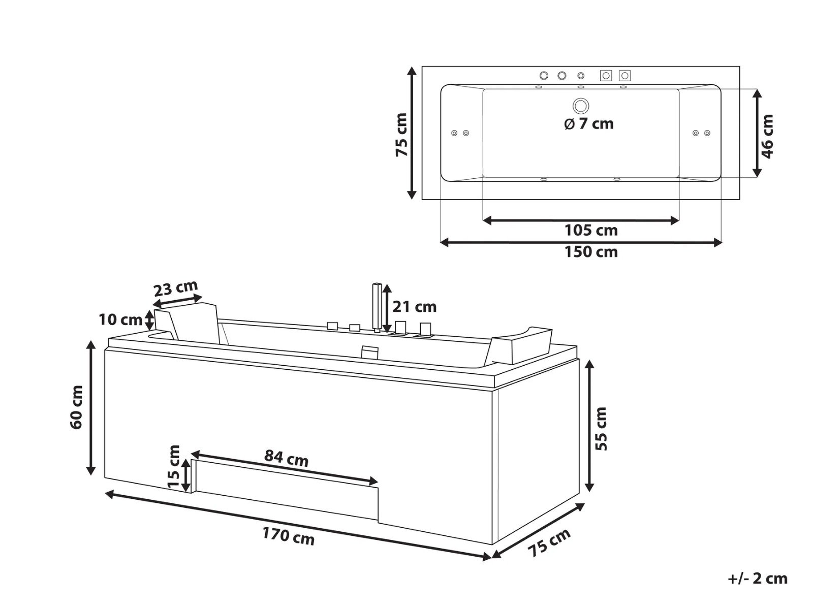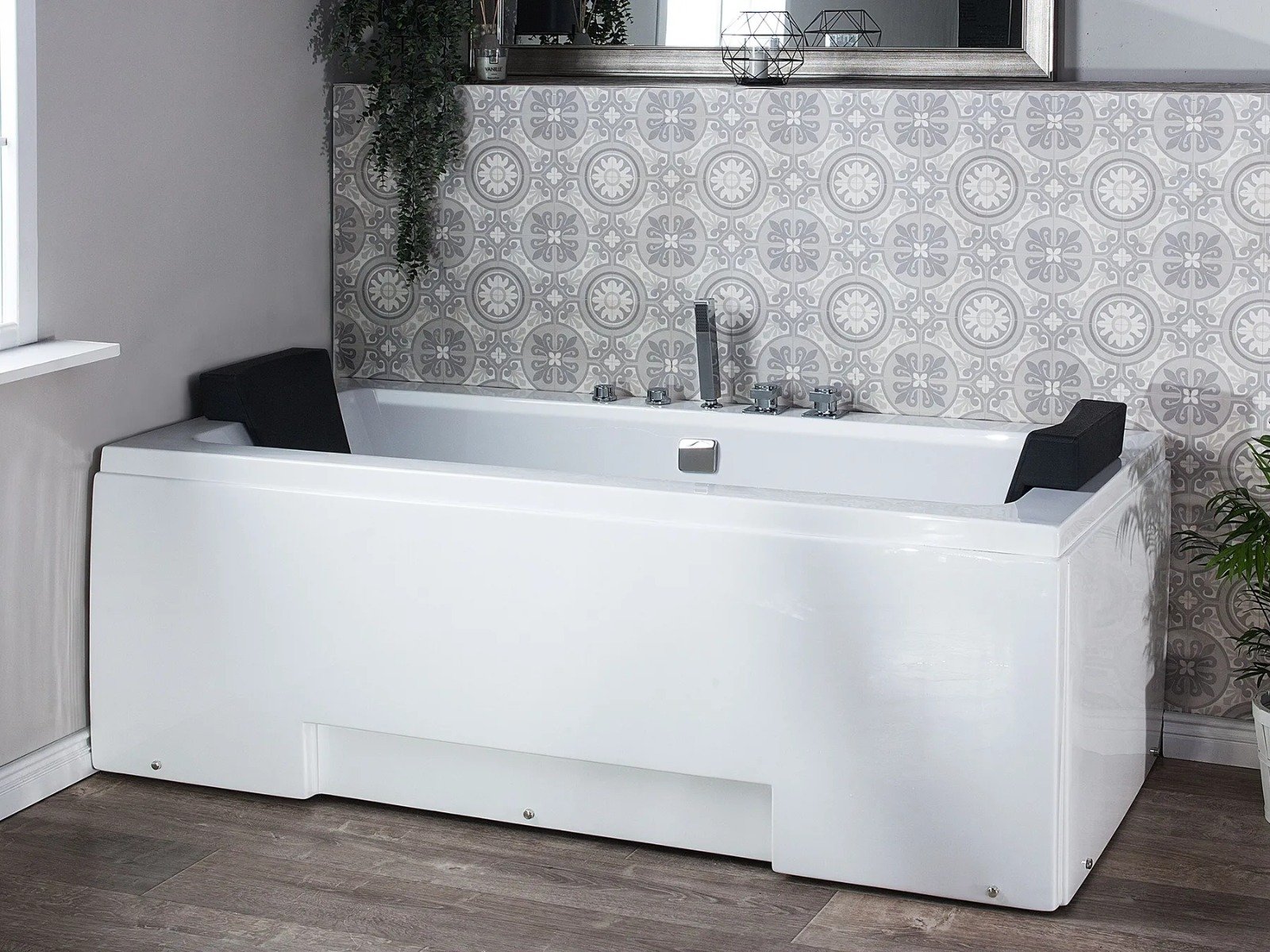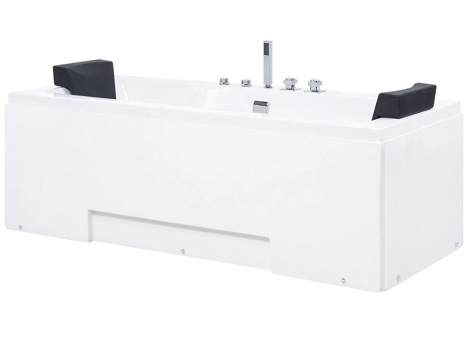 Esta bañera, de líneas limpias y diseño rectangular, encaja perfectamente en cualquier baño contemporáneo. Ofrece un equilibrio ideal entre estética y confort. Diseñada para dos personas, incluye reposacabezas de polipiel a cada lado y grifería central, lo que permite disfrutar de un baño relajante en pareja.