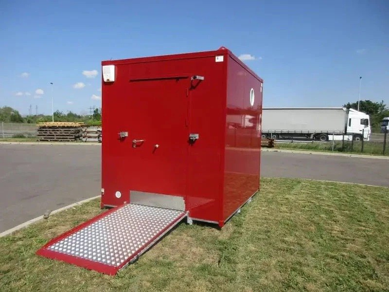 El módulo cuenta con un inodoro adaptado con barras de apoyo y un dispensador de papel, junto con un lavabo adaptado y un espejo ajustable. La seguridad y el apoyo están garantizados por barras de sujeción adicionales estratégicamente ubicadas cerca de la puerta y el lavabo. El acceso es sencillo gracias a una amplia puerta de 1900 mm de ancho con cerradura y una rampa plegable.
