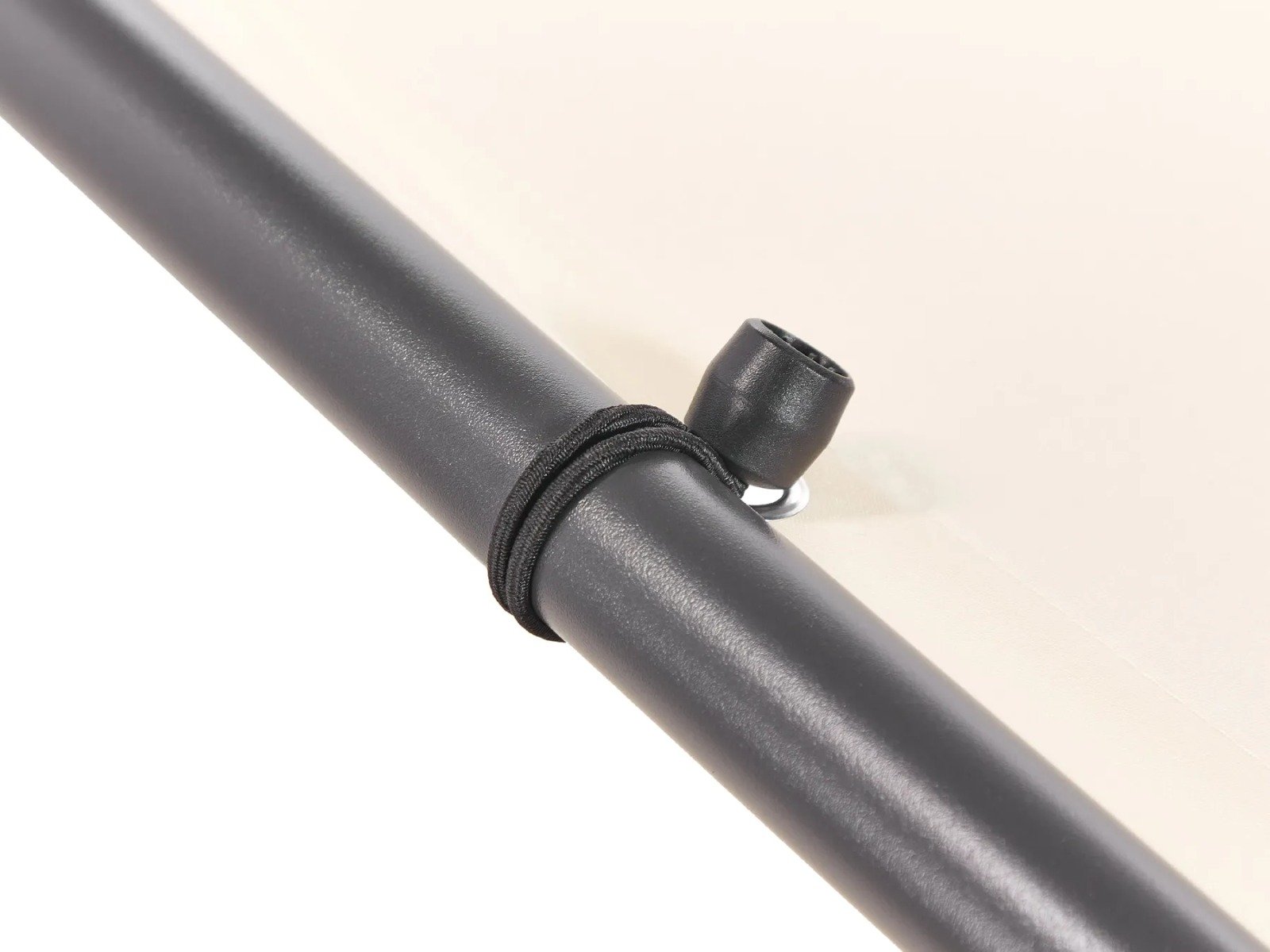 Estructura robusta de acero con recubrimiento en polvo en negro, con un toldo beige de diseño elegante. Ofrece una excepcional protección UV UPF 50+ (filtra el 98% de la radiación UV). Su montaje es sencillo, con estacas incluidas y sin necesidad de cimientos.