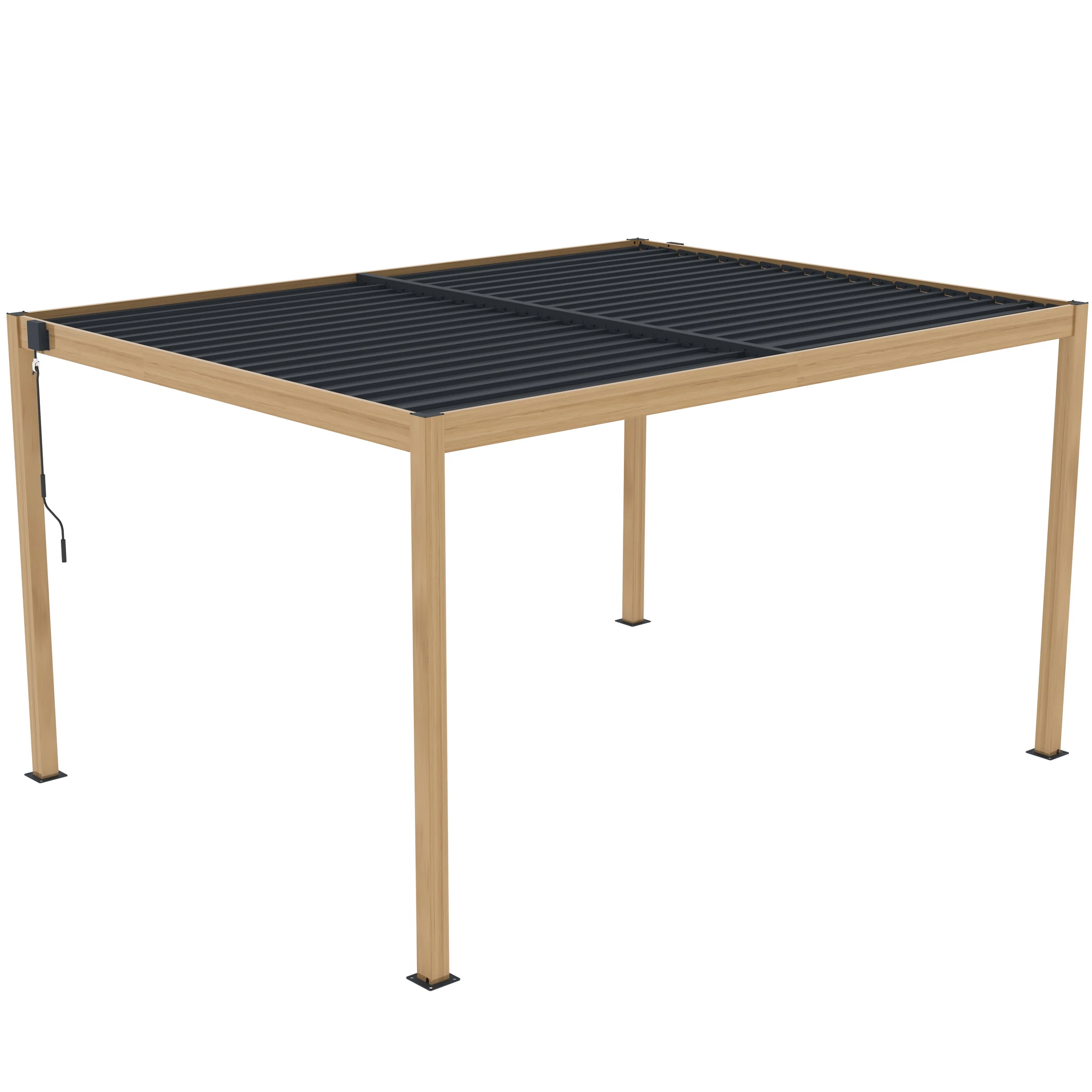 Esta pérgola NO es de madera (es de acero galvanizado y aluminio); está acabada en color madera de altísima calidad, resistente y duradera durante muchos años.