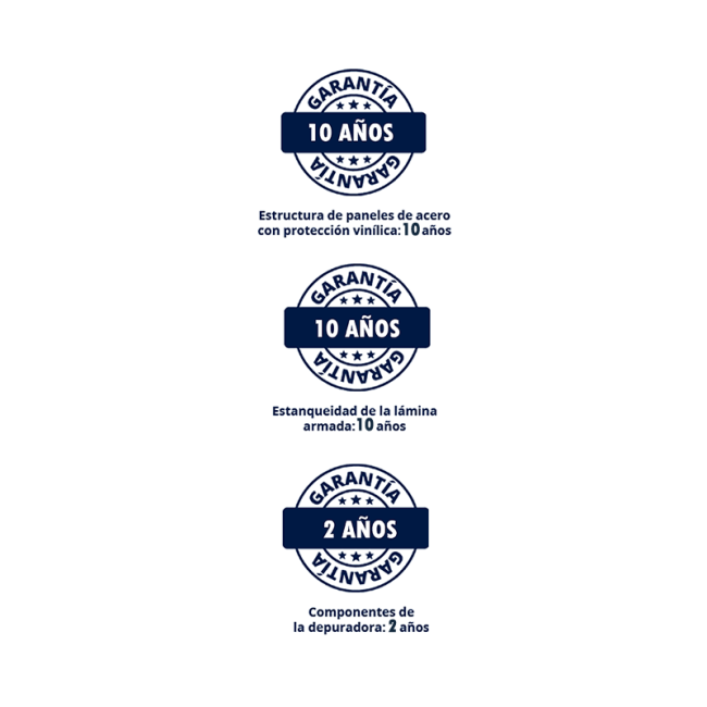 Toda la piscina está revestida con lámina armada, por lo que puede elegir el estampado que quiera para la estética de la piscina. Pudiendo elegir entre un mismo diseño para el total de la estructura, o diferentes estampados para el interior y el exterior del casco.