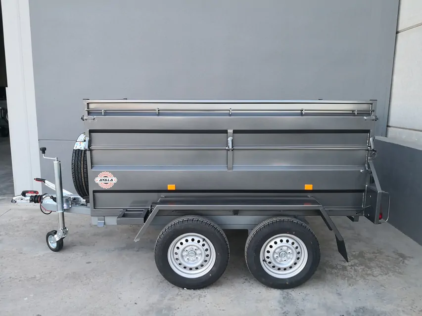 Remolque abierto con ruedas externas, dos ruedas marca Alko de 1000 kg cada una (750 kg), freno de inercia y de estacionamiento, laterales fijos de 50 cm de altura, brazo basculante con bomba hidráulica manual, pintura metalizada, llantas 155/80 r13 y 155/80 r14 , rueda de repuesto, sistema eléctrico de 7 polos, barra en V reforzada y volante automático.